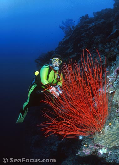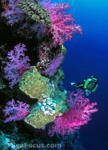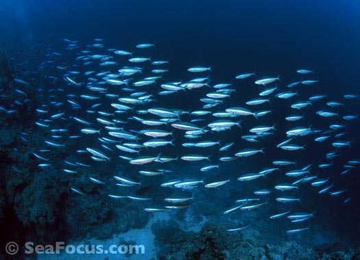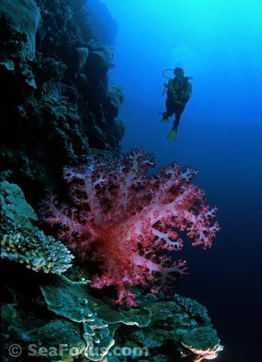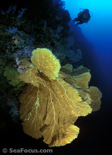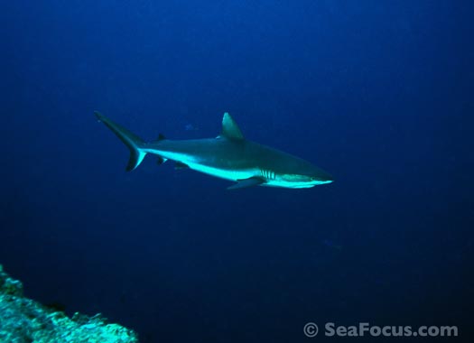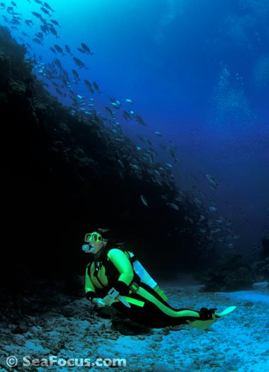 The most exciting feature is diving through the channels. Gradually descending from about six metres to 25, and all the time approaching the open sea, you meet whitetip sharks, giant cod who keep divers company then, as the tide turns and the current picks up, you get pulled swiftly towards the outer reef and whatever lies beyond – often more sharks surrounded by schooling jacks.