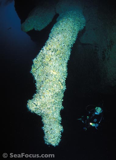 The most famous dive is, of course, the Blue Hole on Lighthouse Reef. It gained some notoriety through the Jacques Cousteau documentary and is now heavily hyped. The hole is over 300 metres across and drops to around 150 metres deep. It was believed to have been a cave whose roof fell in at the end of the Ice Age. At around 40 metres there is a shelf with ancient stalagmites to back up this theory. Apart from this geological feature, the dive is surprisingly lifeless but as the area is visited by grey reef sharks, dive operators now use bait to ensure their presence. As you ascend for a safety stop they circle divers hoping for further handouts.
