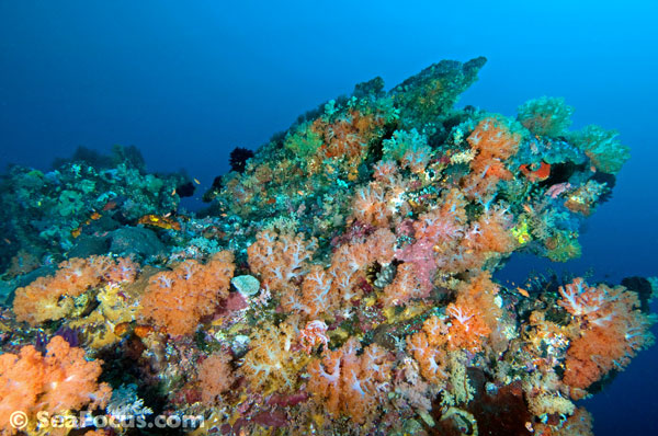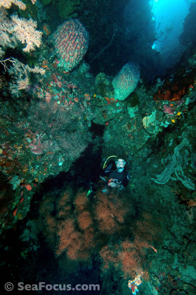 Currents can be strong at times (and often extremely strong) and minimal at others. This is because the western side of Halmahera is sited in the Indonesian Through-flow, the current pattern that catches substantial sea movement between the Pacific and Indian oceans. Dive sites included walls, pinnacles and sloping reef mounds. A little more unusual, were the substantial rock formations. Fish quantities were lower than elsewhere and in 10 days we only saw one shark and one turtle. However, macro life was impressive with a lot of muck diving sites and masses of crustaceans.