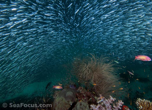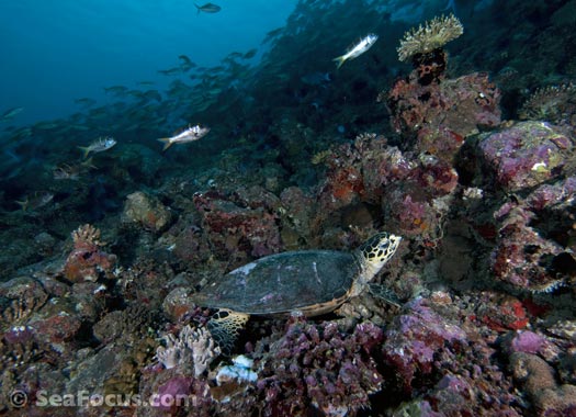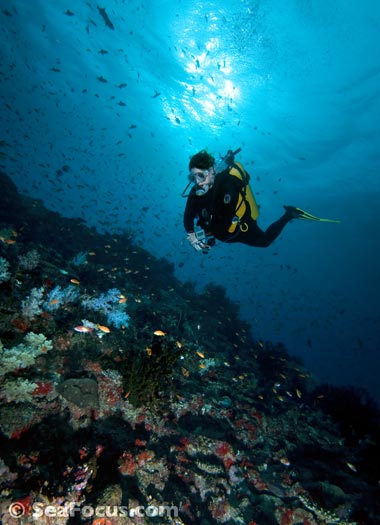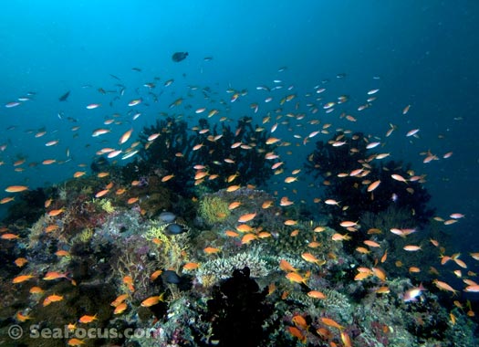 The sailing across to Baa can be rough at certain times of year but it's worth it. The geography means the dives tend to be on small, undersea mounds – called thilas – with many caverns and overhangs that are plastered with pretty, pastel soft corals. The dives are colourful and the fish use the caverns for shelter. Smaller critters seen regularly include frogfish and lobsters, popcorn and mantis shrimp and some pretty nudibranchs.