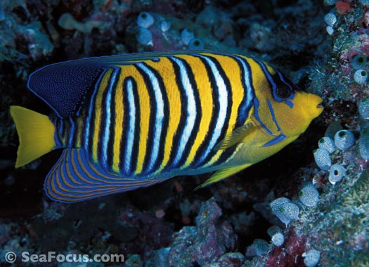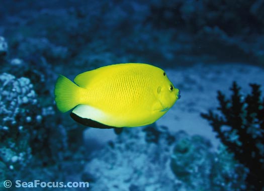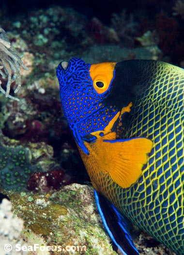 Other body features include small mouths, relatively large pectoral fins and rounded tail fins. Some, like Arabian angels, have streamer-like extensions of the soft dorsal and anal fins. The largest species is the grey angelfish at around 60 centimetres while dwarf angels only reach about 15 centimetres. Smaller angelfish are easily confused with butterflyfish as they have a similar shape, but spot that thorn and you know you’re looking at an angelfish.