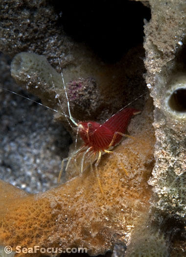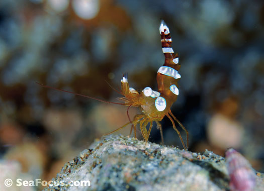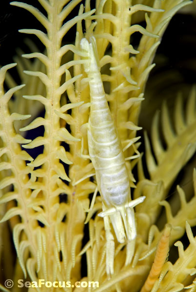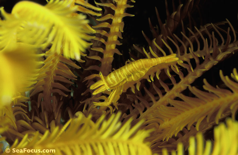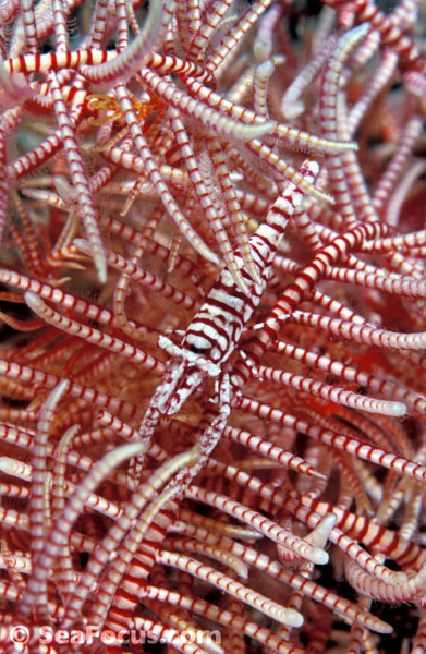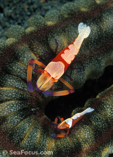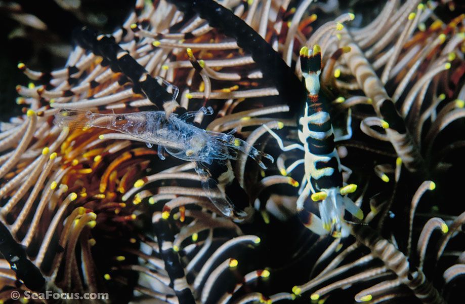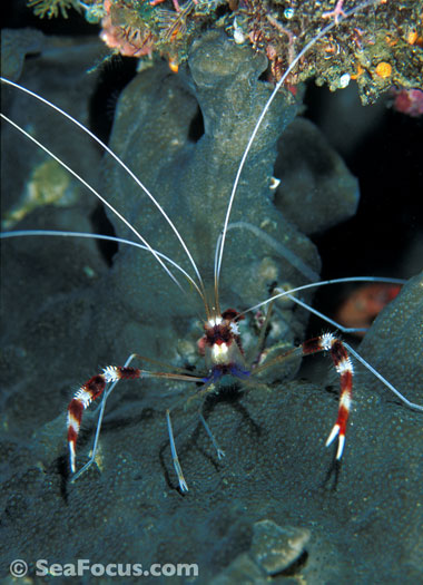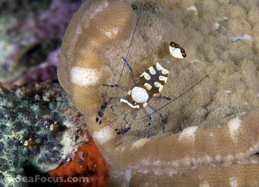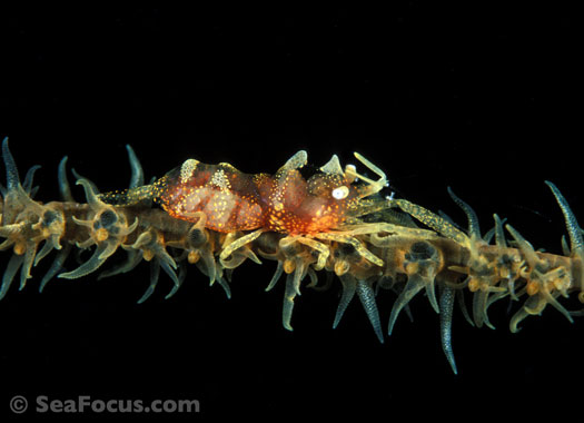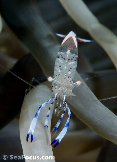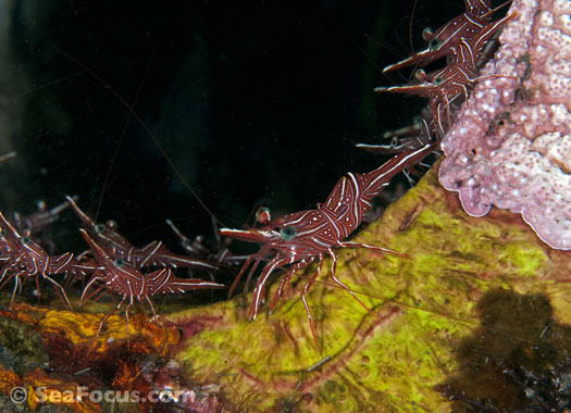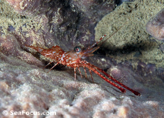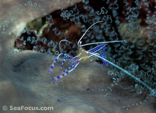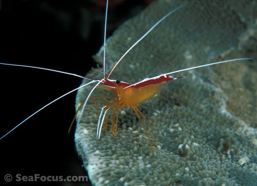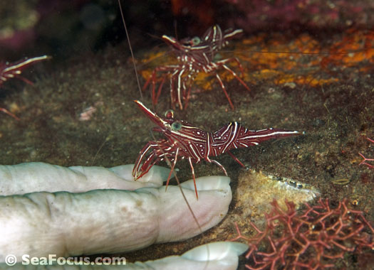For divers, shrimp are seen most. They come in an infinite variety of colours and patterns, which allows them to blend into reef hidey-holes. Whip corals, sea urchins, sea stars and anemones are excellent places to look for them.