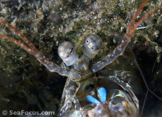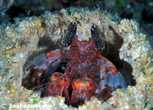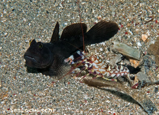 Virtually all shrimp live in a commensal relationship with another species. One of the most fascinating is the relationship between Colman's Shrimp and the toxic fire urchin. Mantis shrimp stand out as having a distinct behavioural pattern. These solitary creatures are characterized by large raptorial appendages that are tucked beneath their heads. These are used as weapons that can strike a prey in three miliseconds and with a huge amount of power. Hence the two common varieties of mantis get nick-named thumbcrackers and spear chuckers. Be warned!