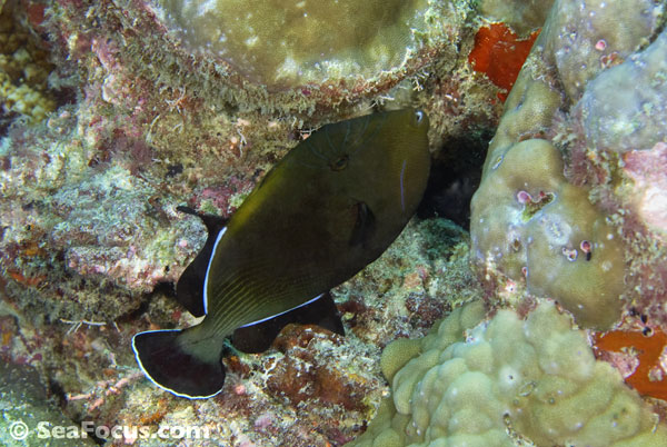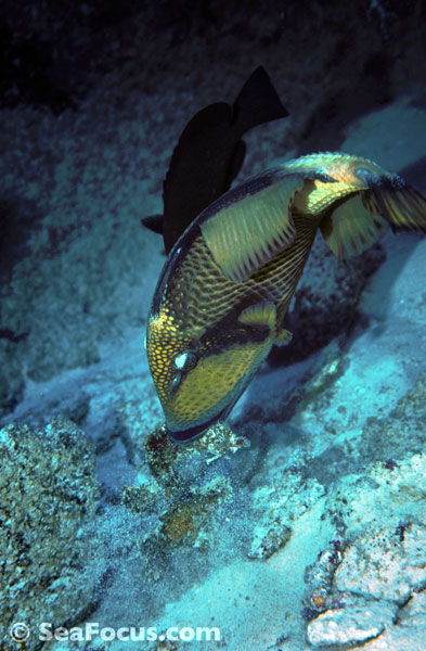 Their name comes from their anterior dorsal fin which is actually a set of three spines. To protection themselves against predators, triggerfish raise the first two dorsal spines, locking the first in place with the the second shorter spine. This is known as the trigger as it also unlocks the first when it is depressed.
